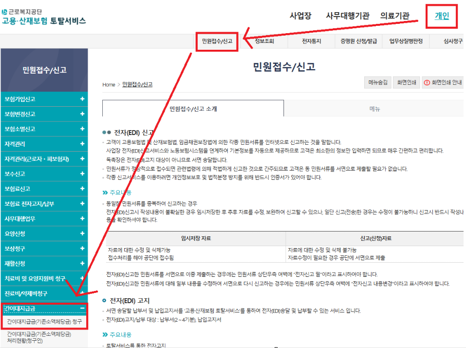 간이대지급금 신청 메뉴 선택: 로그인 후 해당 메뉴에서 신청.