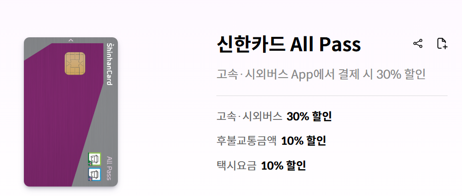 A: 신한카드 All Pass는 고속버스 앱 결제 시 할인율이 더 높습니다.