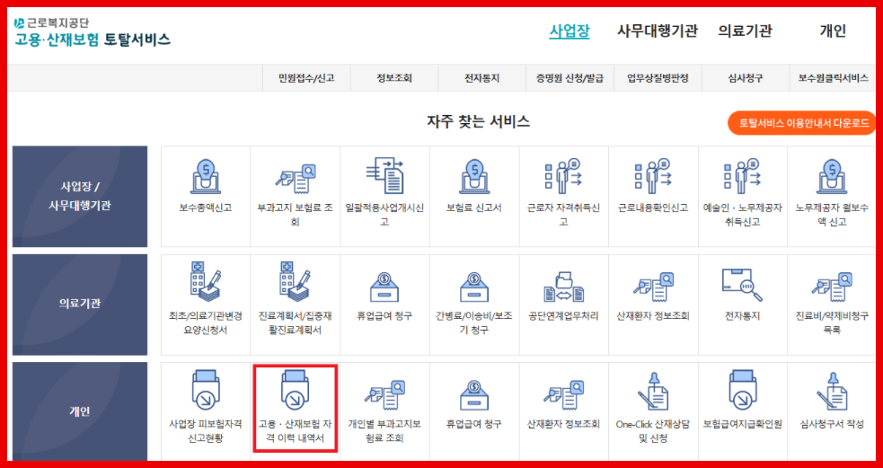 - 메뉴: ‘고용·산재보험 자격이력 내역서’ 선택.