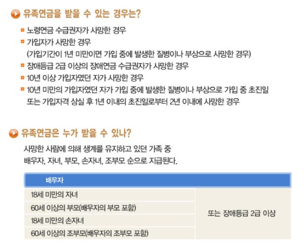 사망자가 아래 조건 중 하나를 충족해야 유족연금 지급이 가능합니다: