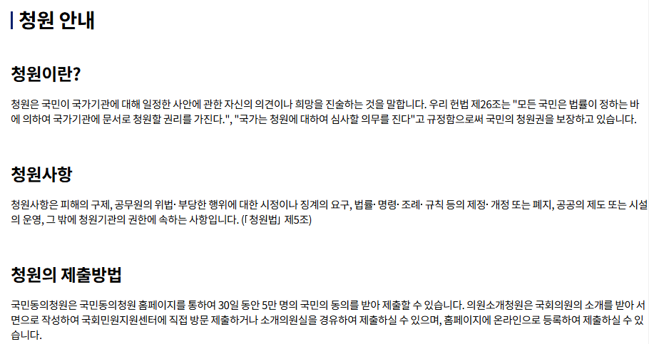 - 일반 시민의 생활과 밀접하게 관련된 문제에 대해 청원 가능.