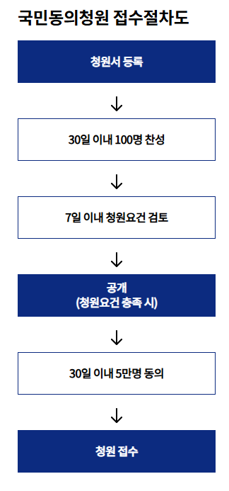 - 청원이 등록되면 30일 이내 100명 이상의 찬성을 받아야 공개됩니다.