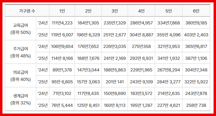 | 가구원 수 | 월 지원금액 (2025년 기준) |