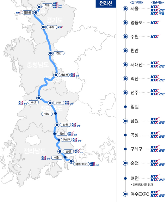 서울 → 영등포 → 수원 → 천안 → 서대전 → 익산 → 전주 → 임실 → 남원 → 곡성 → 구례구 → 순천 → 여천 → 여수엑스포