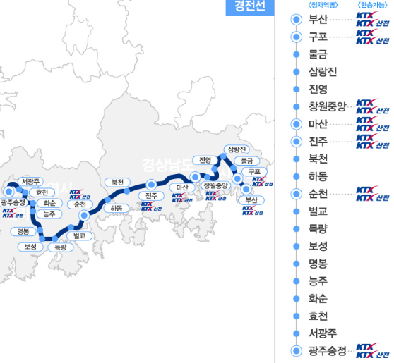 - 하행 시간표: 부산(08:13) → 광주송정(13:13)