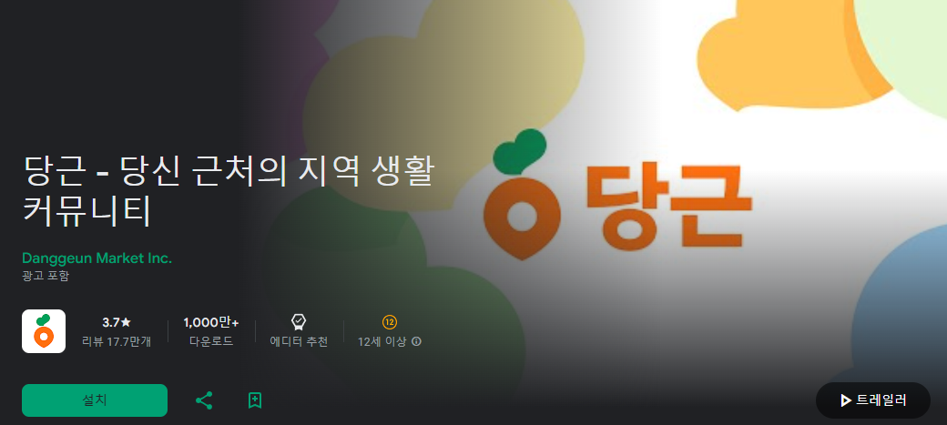 - 플레이스토어(안드로이드) 또는 앱스토어(아이폰)에서 '당근마켓'을 검색합니다.