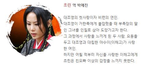 | 박예진 | 초린 | 거란 공주, 대조영의 연인 |