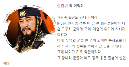 | 이덕화 | 설인귀 | 당나라 명장, 천문령 전투 지휘관 |