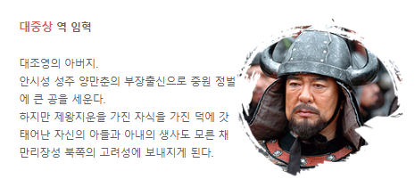 | 최수종 | 대조영 | 발해 건국 군주, 고구려 유민의 지도자 |