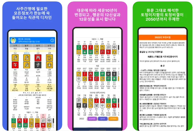 - 토정비결, 당사주: 상세 운세 풀이 제공.