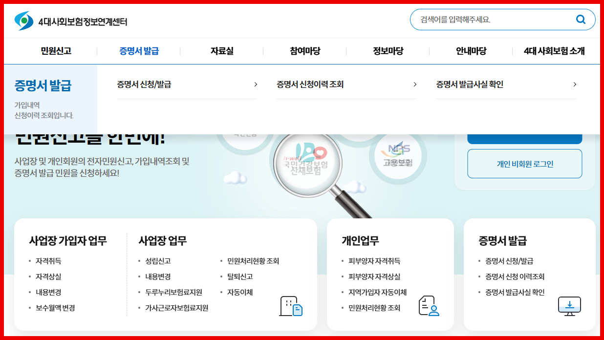 - 가입자 수가 많은 사업장은 4대사회보험 정보연계센터에서 발급 불가하며, 지사 민원창구를 방문해야 합니다.