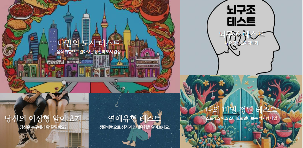 - 창의적인 심리테스트: 기존 성격 유형 테스트와 차별화된 독창적인 콘텐츠 제공