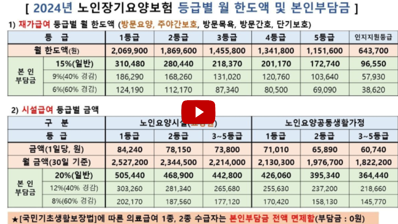 | 본인부담금 비율 | 재가급여: 15%, 시설급여: 20%, 복지용구: 15% |