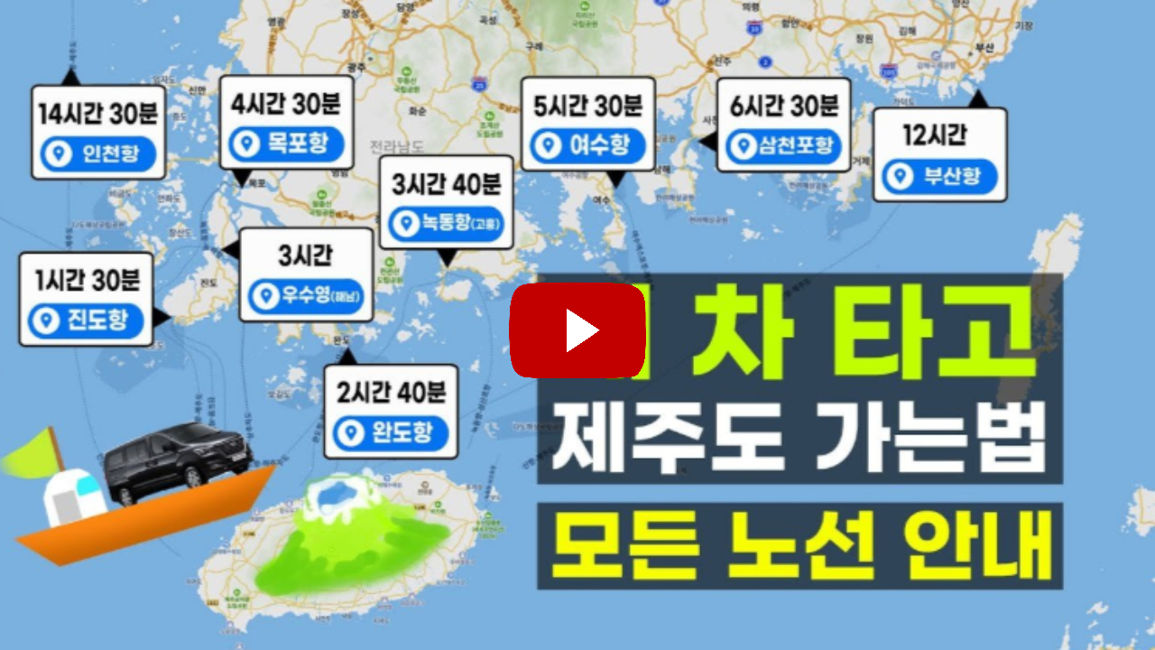 과거 운행되던 인천과 부산에서 제주로 가는 배편은 현재 무기한 휴양 상태입니다. 따라서 수도권 및 경상권에서 출발하는 경우 남쪽 항구까지 차량을 운전해 와야 합니다.
