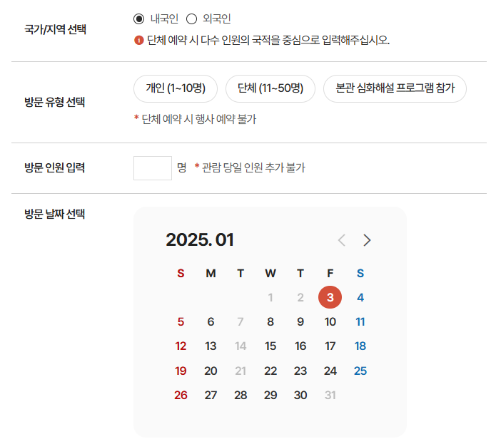 - 개인은 1~10명까지, 단체는 11~50명까지 예약 가능합니다.