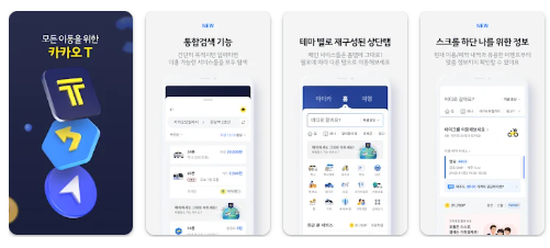 카카오택시(Kakao T) 앱은 Android(플레이스토어) 및 iOS(앱스토어) 에서 다운로드 가능하다.