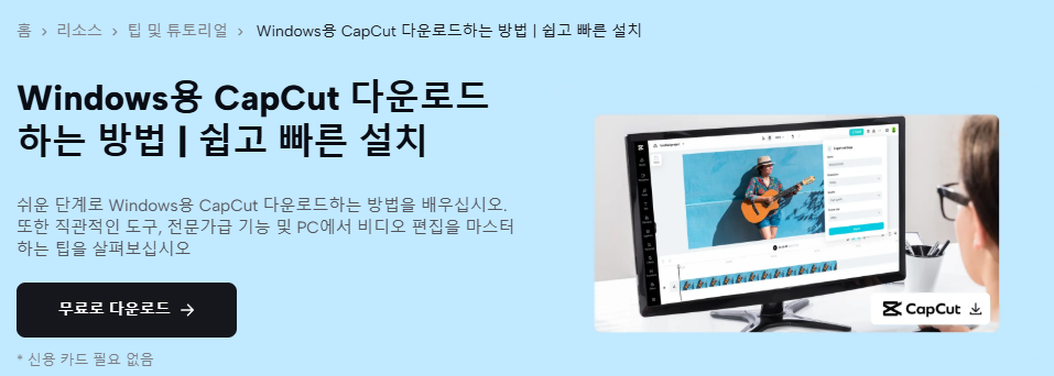 • "Windows용 다운로드" 버튼을 클릭하면 CapCut_Setup.exe 파일(약 200MB)이 다운로드됩니다.