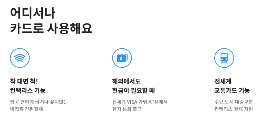| 주요 특징 | 잔액 부족 시: 즉시 결제 거부 (앱에서 실시간 잔액 확인 필수) 환율: 사용 시점의 실시간 환율 적용 수수료: 환전 및 결제 수수료 무료 |