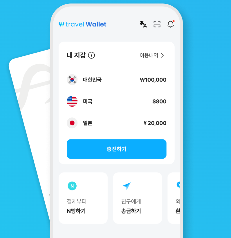 - 남은 금액은 트래블월렛 앱을 통해 다시 원화로 환전하여 계좌로 이체할 수 있습니다.