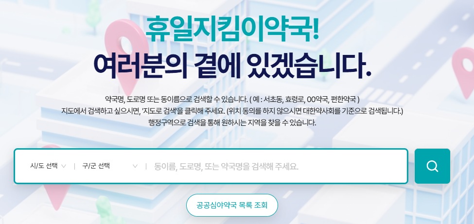 - 접속 방법: 인터넷 검색창에 "대한약사회 휴일지킴이 약국"을 검색하여 접속