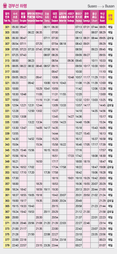 • 수서 - 부산 노선: 수서 → 동탄 → 대전 → 동대구 → 부산